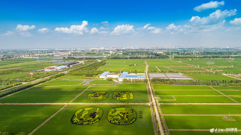 2019年7月20日,江蘇鹽城東臺市五烈鎮(zhèn)現(xiàn)代農(nóng)業(yè)示范園內(nèi),航拍鏡頭下的“董永七仙女傳說”稻田畫充滿著古典神韻。