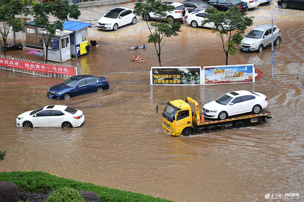 2019年7月20日,昆明,市民在積水路段穿行。當(dāng)日,昆明市主城區(qū)出現(xiàn)大到暴雨天氣,多處路段出現(xiàn)淹積水,車輛與行人通行受影響,最深處積水達(dá)80厘米。
