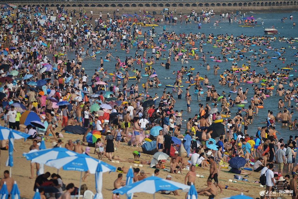 2019年7月21日,青島迎來高溫天氣,青島第一海水浴場迎來消夏避暑熱潮,眾多游客“下餃子”納涼,以躲避酷熱的高溫天氣。