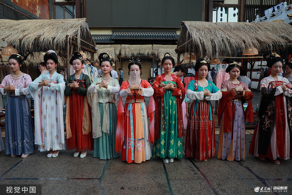 2019年7月27日,西安,在《長安十二時辰》帶火的大唐西市,一群穿著傳統(tǒng)漢服的青春帥男美女,冒著酷熱表演傳統(tǒng)禮儀和舞蹈,還乘坐電梯在唐風古韻的西市風情街悠閑逛游,恍若穿越時空。原來是這群漢服愛好者在這里開辦的“唐隱市”平臺里,以漢服這一傳統(tǒng)文化元素,讓更多民眾和游客了解漢服,傳承文化。