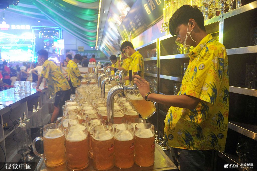 2019年7月28日,第29屆青島國際啤酒節(jié)進(jìn)入第三天,越來越多的中外游客進(jìn)入位于海邊的青島金沙灘啤酒城游玩、喝啤酒、狂歡,盛夏的夜晚整個(gè)海岸充滿啤酒的醇香和歡樂。