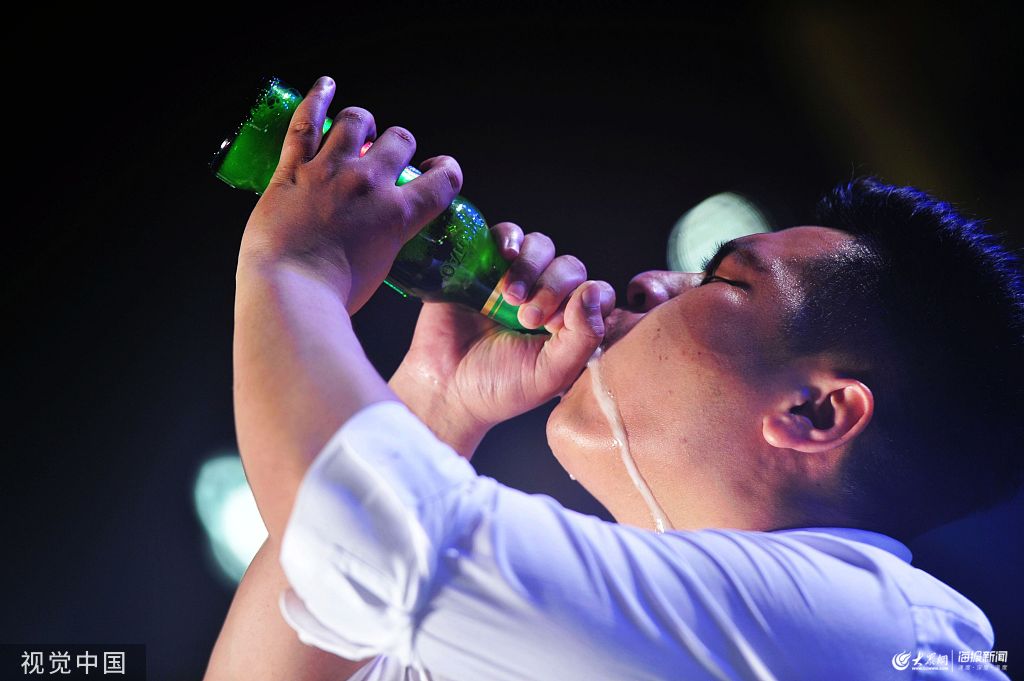 2019年7月30日晚,第29屆青島國際啤酒節(jié)在金沙灘啤酒城舉辦首場飲酒大賽,從數(shù)百名報名參加飲酒比賽中篩選出來的20名選手參加了周賽,通過500毫升吹瓶和1500毫升大杯速飲兩輪比賽,最終6名參賽選手晉級決賽。圖片作者:俞方平/視覺中國