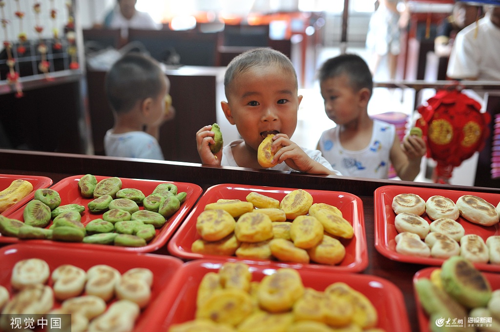 2019年8月6日,青島,在“七夕”節(jié)到來(lái)之際,市北區(qū)水清溝街道舉辦制作“卡花”迎七夕的傳統(tǒng)民俗活動(dòng)。制作“卡花”傳統(tǒng)民俗流傳于膠東半島一帶,人們會(huì)將制作好的“卡花”分送親友。圖為小朋友在活動(dòng)現(xiàn)場(chǎng)分享傳統(tǒng)特色食品“卡花”。