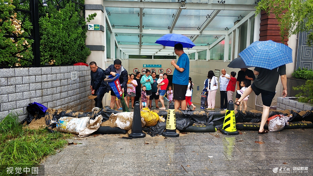 2019年8月11日,山東濱州,一小區(qū)物業(yè)在地下車庫門口,設(shè)置防汛帶。