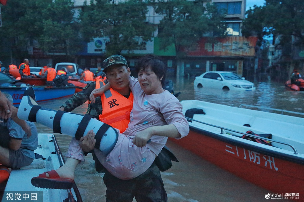 2019年8月11日5時(shí)許,受臺(tái)風(fēng)影響,浙江臨海部分地區(qū)被淹,武警開展救援工作,救援人員將一位腿部安裝了支架的受困婦女抱起,轉(zhuǎn)移到安全地區(qū)。
