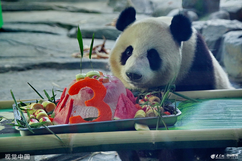 2019年8月17日,來武漢生活近一月的“胖妞”迎來了3周歲的生日,武漢動物園大熊貓館科普展廳舉辦了一場特殊的生日party,“奶爸奶媽”特制了一個雙層冰鎮(zhèn)水果“蛋糕”送進(jìn)“胖妞”的房間,“胖妞”不愛蛋糕偏愛筍現(xiàn)場賣萌引圍觀。圖片作者:景觀/視覺中國