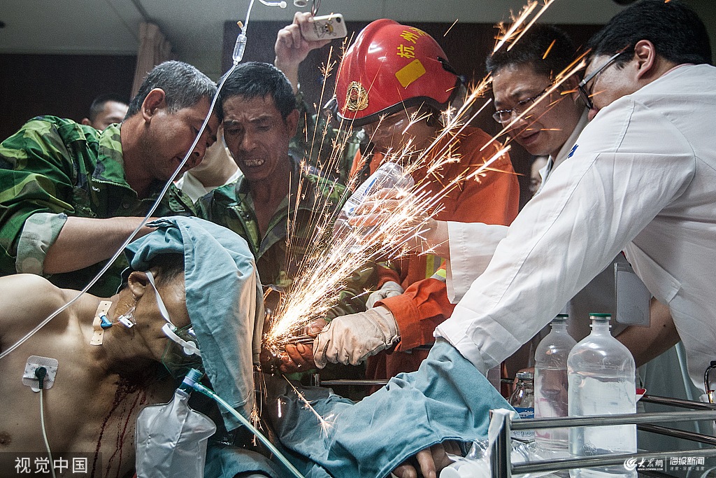 2012年6月12日,杭州,凌晨的醫(yī)院急診室內,工友、消防員和醫(yī)生齊力對插入農民工鄭師傅身體的七根鋼筋進行切割。前一天下午,鄭師傅在福建的工地上干活時,被盤轉機器上突然斷掉彈出的鋼筋插進了身體。因當?shù)蒯t(yī)院無法手術,輾轉至杭州。