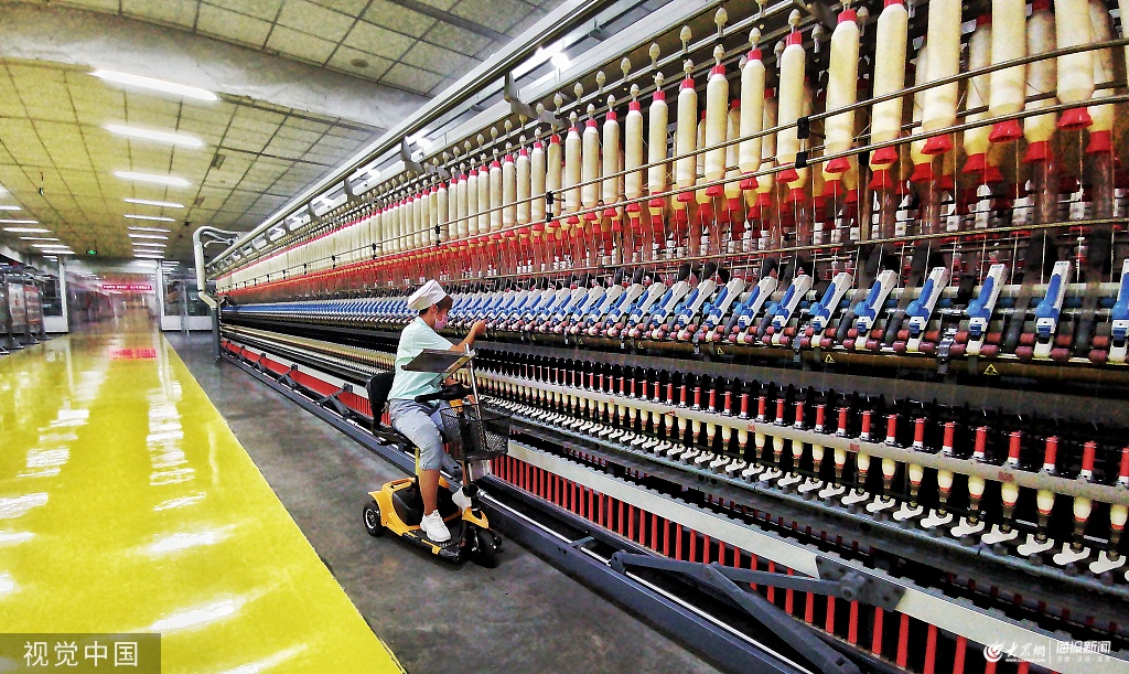 2019年8月22日,在山東援疆的喀什地區(qū)疏勒縣如意科技紡織有限公司緊密紡細(xì)紗車間里,維吾爾族女值車工開著智能電動車,根據(jù)apid顯示的斷頭信息,合理規(guī)劃巡回路線,大大提高了擋車的效率。錢捍/視覺中國