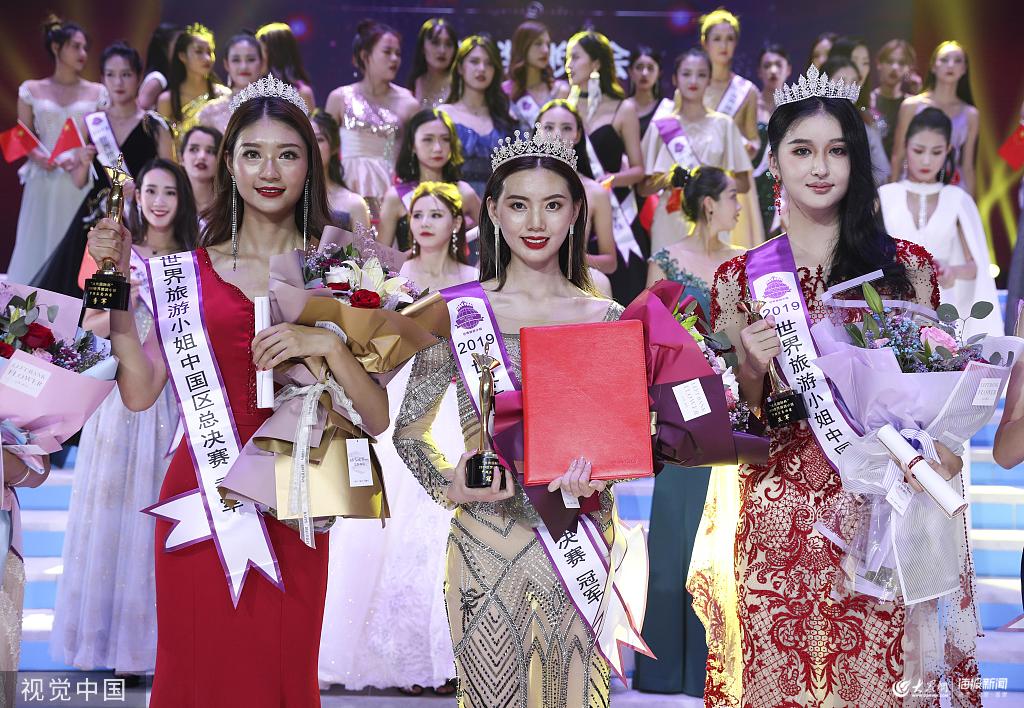 2019年8月28日晚,2019世界旅游小姐中國年度冠軍總決賽在內(nèi)蒙古自治區(qū)巴彥淖爾市落下帷幕。來自全國25個(gè)省市賽區(qū)的43名選手經(jīng)過激烈角逐,譚若依(中)最終奪得冠軍,選手陳蕾娜(右)獲得亞軍,米捷睿(左)獲得季軍。 趙雋(攝影部)/中新社/視覺中國