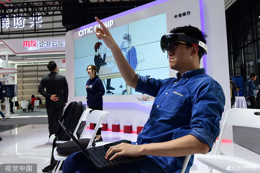 2019年10月18日,浙江烏鎮(zhèn),“互聯(lián)網(wǎng)之光”博覽會開幕。穿戴式電腦hololens。