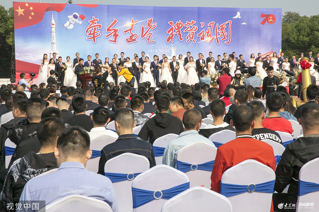 2019年10月20日,江蘇無(wú)錫,中國(guó)衛(wèi)星海上測(cè)控部24對(duì)航天伉儷在同事、家人和駐地親友的祝福聲中走上集體婚禮的紅毯,邁入幸福之門(mén),向彼此許下一生的承諾。