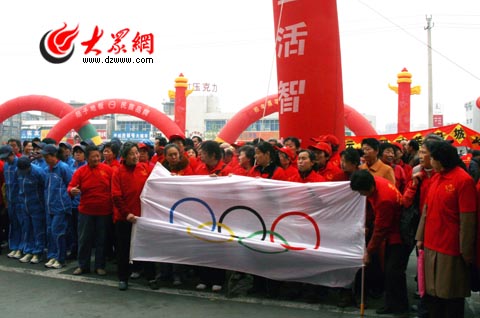 起跑點(diǎn)上,市民撐起奧運(yùn)旗幟為長(zhǎng)跑隊(duì)員吶喊助威
