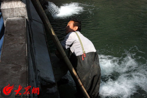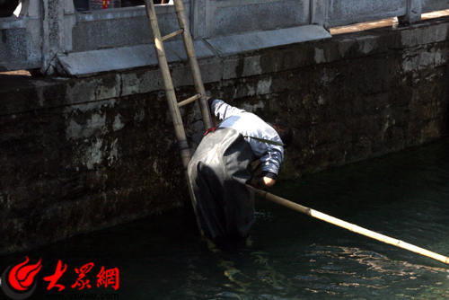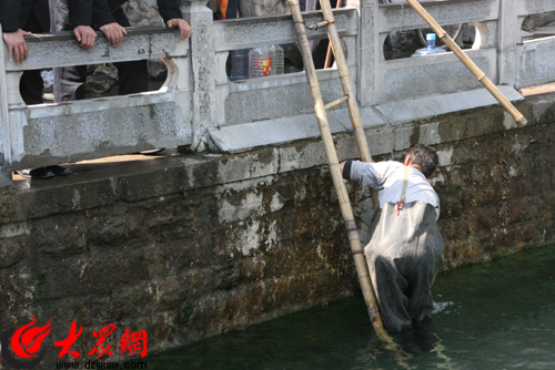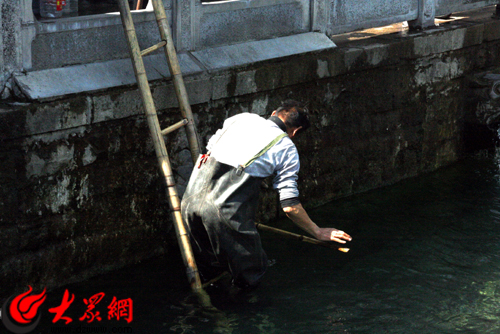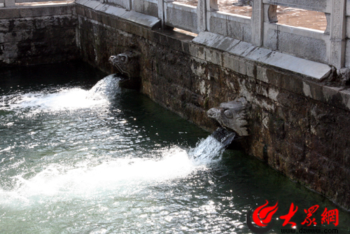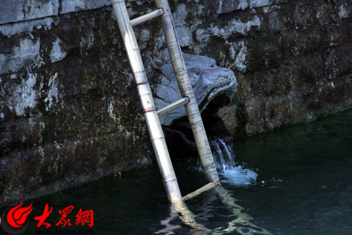 難道黑虎泉要斷流?可東西兩個(gè)虎頭依然水勢(shì)洶涌。工作人員穿上皮褲下到池中,用長(zhǎng)竹竿捅了一下中間虎頭的“喉嚨”,竟然捅出一個(gè)藍(lán)色的小水桶,水流嘩的一聲大了起來(lái)。原來(lái)是水桶堵住了虎頭的水流,“黑虎”如鯁在喉,自然難“吐”為快。