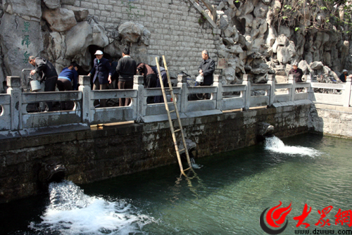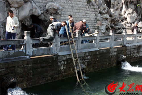 工作人員告訴記者,雖然黑虎泉畔新建了取水點(diǎn),但仍有不好市民到泉口來(lái)取水,水桶掉進(jìn)水里也不打撈,很容易造成堵塞! 。記者 趙永剛 攝影報(bào)道)