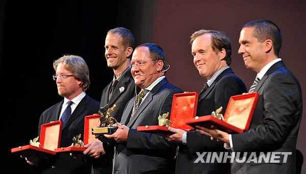 9月6日,在意大利威尼斯利多島,(從左至右)《海底總動員》導(dǎo)演安德魯·斯坦頓、《飛屋環(huán)游記》導(dǎo)演皮特·多克特、《玩具總動員》系列影片前兩集的導(dǎo)演約翰·拉塞特、《料理鼠王》導(dǎo)演布拉德·伯德以及《玩具總動員2》的導(dǎo)演之一李·昂克里奇展示獲得的第66屆威尼斯電影節(jié)“終身成就金獅獎”。新華社記者武巍攝
