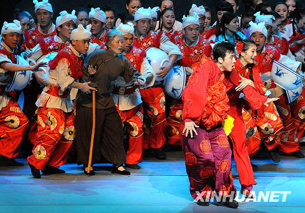 當日,作為慶祝新中國成立60周年獻禮演出劇目之一的大型陜北信天游歌舞劇《山丹丹》在北京國家大劇院演出!渡降さぁ酚申兾魇瞧鹂h和延安吳起采油廠長征藝術團編排,采用陜北信天游的形式,以發(fā)生在陜北地區(qū)的一對青年男女之間生死不渝、感人至深的愛情故事為題材,生動地向人們展示出陜北黃土風情文化的魅力。新華社記者陶明攝