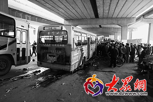 生活日?qǐng)?bào)3月30日訊(記者 趙國(guó)陸)今天上午,一輛停放在山東劇院高架橋下的公交車(chē)突然從坡道上滑下來(lái),造成一名市民死亡。 上午10:10,記者趕到現(xiàn)場(chǎng)時(shí),傷者剛被120急救人員從車(chē)底救出來(lái)送往醫(yī)院。一名中年女子坐在一邊驚恐不安地摸著頭,嘴里喃喃自語(yǔ),顯然受到了驚嚇。車(chē)下被軋碎的水果攤就是她的,當(dāng)時(shí)她正在招呼一位女顧客,突然被重重地頂了個(gè)跟頭,而那位女顧客直接被卷進(jìn)車(chē)底,輪子從身上碾了過(guò)去。120急救車(chē)隨后趕到現(xiàn)場(chǎng),醫(yī)護(hù)人員將滿身是血的傷員從車(chē)底弄出來(lái),該女子已經(jīng)奄奄一息。據(jù)目擊者李先生說(shuō),當(dāng)時(shí)公交車(chē)上沒(méi)有人,是一輛空車(chē),不知道什么原因滑下來(lái)了。記者注意到,橋下被改造成停車(chē)場(chǎng),停放著幾十輛公交車(chē),115路、14路等公交車(chē)頻繁發(fā)車(chē)、進(jìn)站,而周?chē)愤厺M是流動(dòng)攤販,人員流動(dòng)量很大。下午,記者從山大齊魯醫(yī)院了解到,經(jīng)過(guò)全力搶救,未能挽回傷員生命。 。ㄓ浾摺∷{(lán)峰 攝)