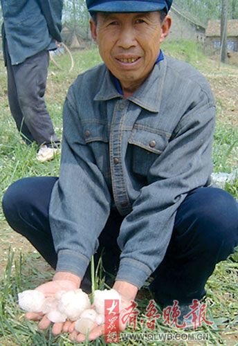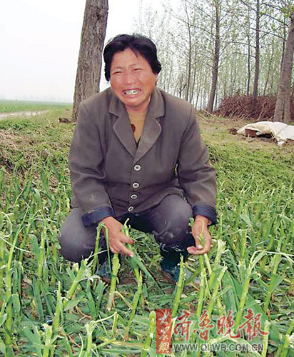 左圖:金鄉(xiāng)蒜農(nóng)在冰雹襲擊過(guò)的蒜地里失聲痛哭! 埡昀凇z