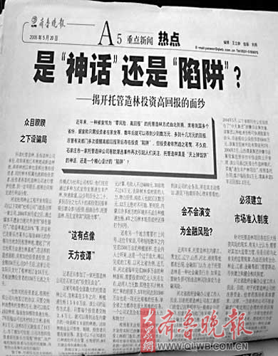。玻埃埃茨辏保霸拢玻啡,受害人代某來到“馳太木業(yè)”的一個會場。當(dāng)時已經(jīng)有四五十人在會場,共同聽一個姓王的副總講課。主要就是講投資林木的合法性和投資的高回報、低風(fēng)險。下午,公司的馬某就帶領(lǐng)他們趕到高唐縣一速生楊基地查看。當(dāng)天晚上,代某與“馳太木業(yè)”草簽合同,購買了35畝林地。事后,代某意識到這可能是個騙局,要求退款,但遭到蠻橫拒絕。11月18日,公司消失后他在報紙上發(fā)現(xiàn)了一則小聲明,聲明“馳太木業(yè)”合作造林工作暫時結(jié)束,現(xiàn)進行林木管護工作,未拿到林權(quán)證的合作者聽候通知。管護公司地址位于泗水泉林鎮(zhèn),并留下了泗水、高唐的幾個聯(lián)系電話。然而撥打高唐縣“王經(jīng)理”的電話得知,接電話的是高唐縣清平鎮(zhèn)某村的村委主任。村委主任向他講述,“馳太木業(yè)”與村里接觸過,但只是個意向,從未簽過合同。