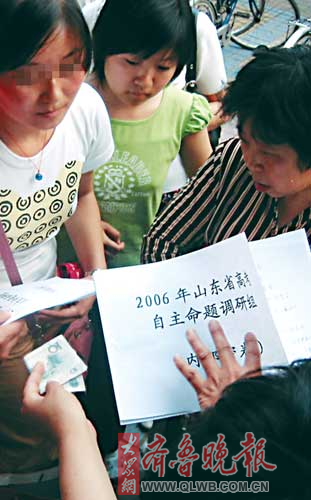 一名賣“試題”的女孩被警方帶走。 喬顯佳 攝 高考首日,在濟南十幾個考點,一些大學(xué)生模樣的人以每份20元的價格兜售“高考試題”,本報記者聯(lián)合省城警方,戳穿了“試題”騙局。 “這套試題是通過關(guān)系從參加今年自主命題的專家那里得到的,這些題目將有90%以上都會在高考試題中出現(xiàn),上午的作文題目就和試題中的一個作文題目吻合,足以看出它的權(quán)威性。”一個20多歲自稱“高校學(xué)生”的清秀女孩向陪考的學(xué)生家長推銷著她手中的試題。 高考首日中午,省城幾個考點附近出現(xiàn)了2006年高考五套試題及答案,雖然語文試題只有兩個作文題目,但其中之一與當(dāng)日高考的語文作文題目驚人相似,這樣巨大誘惑讓陪考的學(xué)生家長難免心動,不少家長掏錢購買。 “內(nèi)部密卷”悄然現(xiàn)身 。啡障挛缈荚嚳颇繛閿(shù)學(xué)。下午3時許,位于濟南一中考點門口東側(cè)的一個小飯館門前一陣騷動。一名身著綠色上衣,牛仔褲的女孩正在散發(fā)一份資料,而資料的封面更加具有誘惑性——“2006年山東省高考自主命題調(diào)研組(內(nèi)部密卷)”。 與此同時,濟南中學(xué)校門西側(cè)也出現(xiàn)了兩男兩女的身影,他們也在用較有煽動性的話極力地贊譽他們手中同樣的試題。記者從一名女孩手中接過一份“高考試題”,第一頁上只有兩個作文題目,第二個題目與7日上午高考試題的作文題目非常相似,只是真題中要求“字數(shù)800字”,而女孩提供的題目要求“字數(shù)600字”。 當(dāng)天下午,濟南二中考點附近也有一些大學(xué)生模樣的人在兜售這樣的試題,根據(jù)濟南警方和部分中學(xué)反饋的消息,7日,在濟南有十多個考點出現(xiàn)同樣的“高考試題”。 家長疑慮仍然購買 下午4時左右,在濟南中學(xué)附近的陪考人群中,“高考試題”成為了眾人談?wù)摰慕裹c話題,多數(shù)家長對此心存疑慮,但大家也不打算失去這個“天上掉下來的餡餅”。 “如果你這套試題是在昨天看考場的時候或者今天語文考試之前賣,別說20元錢,就是賣到200元一份,也有很多人買!币晃粚W(xué)生家長說。 女孩沉著應(yīng)答:“這樣的題目在開考之前不可能拿到,這也是通過關(guān)系拿到的,試題的準確性你們就不要有什么疑問了,已經(jīng)賣出去不少了,買了不會讓你后悔! 盡管這套試題疑點越來越多,但陪考家長開始紛紛掏錢購買,一位男士說:“20元錢也不算貴,如果有用處,就很值得,沒有用也就算了,就當(dāng)買份報紙看看。” 一些家長盡管買了這份試題,但更多的是對這種從天而降的“高考試題”有些擔(dān)心。一位考生母親說,這樣的試題如果是假的,會對孩子造成巨大的負面影響,孩子如果也相信這套試題會和高考題目吻合,而一旦發(fā)現(xiàn)情況有變,即“高考試題”是假的,那么心情就很難調(diào)整過來,影響發(fā)揮在所難免,所以一些學(xué)生家長說:“即使買了這份試題也不會輕易把它給孩子看,除非有十足的把握,才有可能拿給孩子。” 記者報案警方出擊 在這些推銷人員的鼓動下,購買“高考試題”的家長越來越多,本報記者擔(dān)心這樣發(fā)展下去,將會對考生及考試秩序造成影響,于是決定報警。 濟南中學(xué)考點,市中區(qū)公安分局的民警接到記者舉報,立即采取行動,先后將兩個正在兜售試題的女孩帶到該考點的值班室。濟南一中、濟南二中等考點執(zhí)勤的民警及城管執(zhí)法人員也緊急出擊,將兜售試題的相關(guān)人員控制住。 考務(wù)人員驗出假題 別的考點也接到了舉報,濟南市大明湖派出所孟鈞副所長介紹,接警后,他們隨即向考點考務(wù)負責(zé)人及正在巡查的濟南市教育局主要負責(zé)人作了匯報。后者立即著手驗證試題真?zhèn)。?jīng)考務(wù)人員將該套試題逐個與正在考試的數(shù)學(xué)試卷對照,斷定被買賣的“內(nèi)部密卷”毫無價值。 經(jīng)過警方審問查明,被抓獲的賣試題的人多是在校大學(xué)生。6日下午,當(dāng)他們趕到位于北坦大街的某培訓(xùn)學(xué)校應(yīng)聘文具推銷員時,一名姓秦的男子才告訴他們是賣高考預(yù)測題。 下午6時許,秦某被大明湖派出所依法傳喚至所里。他交代,預(yù)測題是濟南某中學(xué)一名張姓老師給他的,封面則是他設(shè)計制作的,目的就是好賣。除了作文題,其他預(yù)測題他早就拿到了,共印了1200份。7日中午1時許,他才拿到語文試題,加急印了1200份后,與其他試題一起裝訂后才分給學(xué)生,每人大約35份。秦某稱,他雇用了30多名大學(xué)生,分布在十余個考點。 目前,警方正在聯(lián)系秦某所稱的中學(xué)老師,進一步展開調(diào)查。 |
