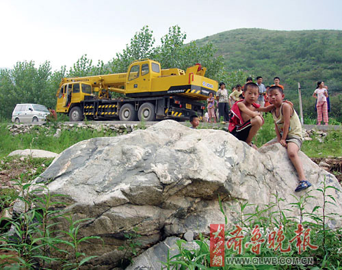 本報(bào)濟(jì)南7月11日訊 11日凌晨3時(shí)許,一輛小汽車(chē)和一輛大吊車(chē),悄悄來(lái)到省城歷城區(qū)西營(yíng)鎮(zhèn)上降甘村,想將路邊河溝里的一塊大石頭吊走。然而,剛把鋼絲繩捆上石頭,就被村民發(fā)現(xiàn),隨即報(bào)警稱(chēng)有人偷他們村的“寶石”。 。保比丈衔纾浾邅(lái)到西營(yíng)鎮(zhèn)上降甘村,發(fā)現(xiàn)路邊上停放著一輛小轎車(chē)和一輛嶄新的大吊車(chē),車(chē)旁邊圍滿了村民。 路邊的河溝里,有一塊長(zhǎng)約3米、高約1米的大石頭,這塊石頭其他地方看上去與普通石頭沒(méi)有什么區(qū)別,其中一面的花紋像一條龍(左圖)。 村民說(shuō),曾經(jīng)有一位專(zhuān)門(mén)收購(gòu)石頭的專(zhuān)家鑒定過(guò),稱(chēng)這塊石頭很有價(jià)值,曾經(jīng)有人出價(jià)30萬(wàn)想買(mǎi)這塊石頭,但是他們沒(méi)有答應(yīng)。 村民李先生告訴記者,11日凌晨3時(shí)許,他們聽(tīng)到外面大車(chē)經(jīng)過(guò)的聲音。比較警覺(jué)的近20名村民查看,發(fā)現(xiàn)路邊停著一輛小汽車(chē)和大吊車(chē),5男1女6個(gè)人正把鋼絲繩捆綁在“寶石”上往外吊。村民隨后阻攔制止,天一亮就報(bào)了案。 記者在西營(yíng)鎮(zhèn)派出所見(jiàn)到了被村民認(rèn)為是偷石頭的“老板”,但是她對(duì)偷運(yùn)石頭矢口否認(rèn)。目前,警方正在調(diào)查此事。 魯超國(guó) 攝 |