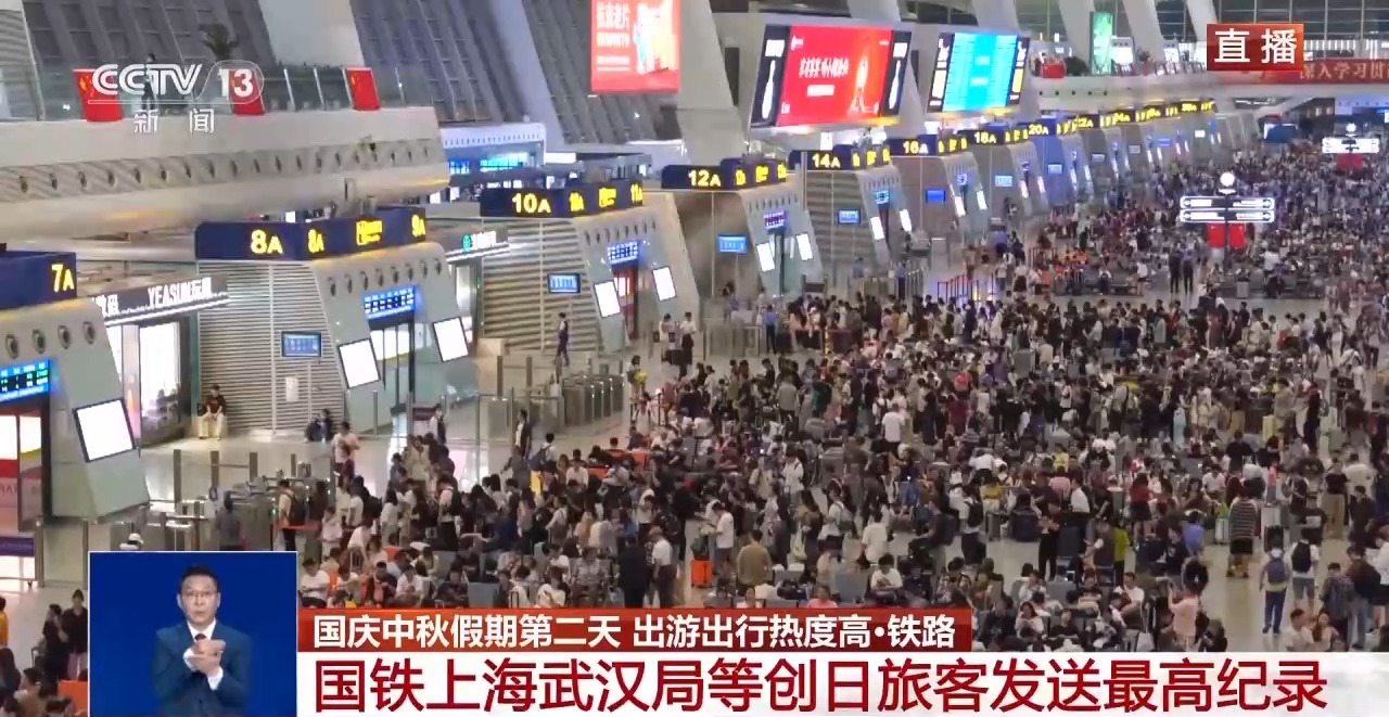 總臺(tái)央視記者 陳俏:從國(guó)鐵集團(tuán)今天發(fā)布的數(shù)據(jù)看,今年國(guó)慶、中秋假期首日,包括國(guó)鐵上海局和國(guó)鐵廣州局等,全國(guó)部分重點(diǎn)地區(qū)的鐵路客運(yùn),都刷新了單日旅客發(fā)送的歷史紀(jì)錄。