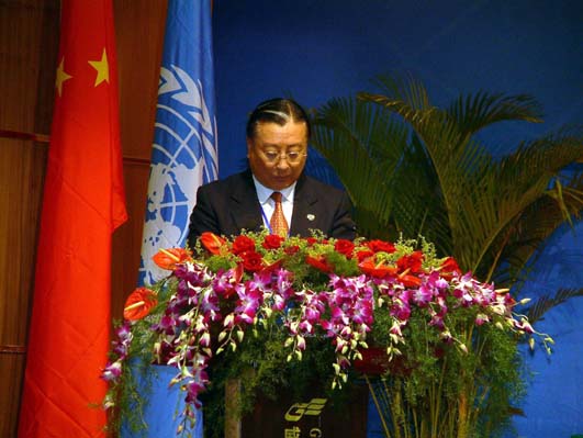 大眾網(wǎng)10月8日威海訊 今天,2004東北亞經(jīng)濟(jì)合作論壇在威海隆重開(kāi)幕。圖為聯(lián)合國(guó)副秘書長(zhǎng)、亞太經(jīng)濟(jì)社會(huì)委員會(huì)執(zhí)行秘書金學(xué)洙在論壇開(kāi)幕式上致辭。(特派記者 曲濤 報(bào)道) |