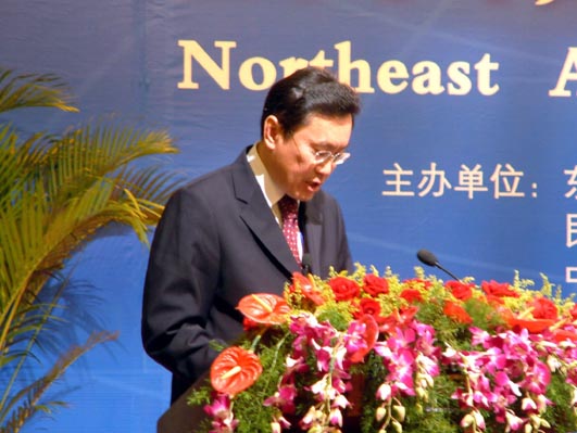 大眾網(wǎng)10月8日威海訊 今天,2004東北亞經(jīng)濟合作論壇在威海隆重開幕。圖為蒙古國前外交部部長額爾敦楚倫在論壇開幕式上致辭。(特派記者 曲濤 報道) |