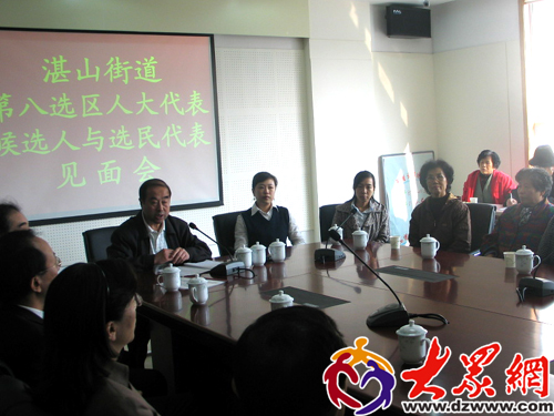 11月14日下午,青島市市南區(qū)湛山街道辦事處會議室內氣氛熱烈,暖意融融,湛山街道第八選區(qū)人大代表候選人正在這里與選民代表見面。幾十位選民代表輪翻向三位代表候選人提問,選民們最關心的就是候選人當選代表后能為社區(qū),能為老百姓做些什么。