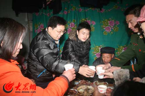 當穿行在排排板房之間時,一位叫劉明翠的羌族婦女盛情把我們讓進了板房!澳銈冞^年回不來家里,來我們這里吃團年飯吧”。記者出 去買了兩瓶當?shù)刈詈玫木疲瑴蕚渥隹瓦@戶人家。家里有一位老人,是劉明翠的公公黃振喜,今年72歲的他,在地震中遭遇失親巨痛,他的四兒 子、大兒媳、孫女(懷孕8個月)、重孫子都在地震中遇難了。過年了,身邊一下子缺少了很多親人,老人雖然因為陌生的原因盡量在記者面前 掩飾痛苦,但紅紅的眼睛里說明一切。
