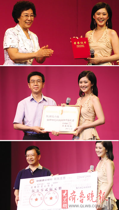 濟南市副市長張澤向張娜拉頒發(fā)“濟南慈善大使”榮譽證書。齊魯晚報·生活日報總編輯郝克遠向張娜拉頒發(fā)“榮譽記者”證書。齊魯晚報·生活日報總經(jīng)理梁洪文向張娜拉轉(zhuǎn)交兩報捐贈的5萬多元善款。