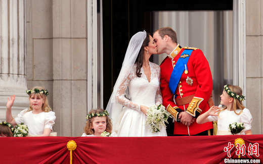 4月29日,英國倫敦,威廉王子與凱特在白金漢宮陽臺深情一吻。當(dāng)?shù)貢r(shí)間11時(shí),英國威廉王子與攜手相戀多年的女友凱特·米德爾頓,正式步入婚姻殿堂,舉辦一場新世紀(jì)的“童話婚禮”。