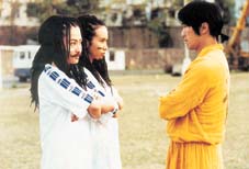 周星馳一聲號(hào)召,張柏芝和莫文蔚二話不說(shuō),于百忙中抽空為“少林足球”義務(wù)客串演出一天,這份情誼令星爺十分感激。兩位美女反串球星,以“玉面雙飛龍”姿態(tài),與星爺在片中大斗球技。她們黏上胡須,梳細(xì)辮的“古力特頭”造型,非常搞笑。