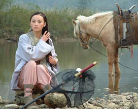 驚艷穆念慈 蔣勤勤飾演的穆念慈今天第一次露臉,與剛由南帝治好傷的黃蓉和郭靖相遇,布衣淡妝一付平民的打扮,神情淡漠,無論是戲中還是休息中都是孤單一人,不象蓉兒有郭哥相伴,親自接送。去對岸換妝也只有女化妝師相伴,此情此景正與劇情相符,換妝后的穆念慈長發(fā)垂肩,與白馬一起坐在沙灘邊洗理青絲,黑紗白花顯示楊康已死,奇山秀水中更襯托出一種凄涼之美。(黃孝偉)