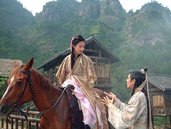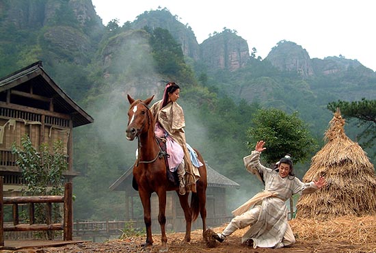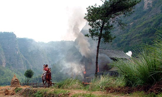 后又在火海中逃出,并轡遠(yuǎn)飛的戲。一直到下午兩點(diǎn)才拍攝完。女主角劉亦菲就回到北京去學(xué)校報(bào)到,10月2日又要趕回新昌參與武戲拍攝。