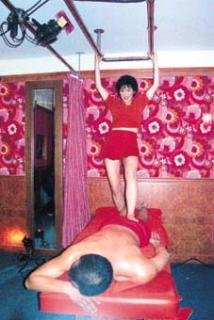為赤膊上陣的胡軍按摩,她以雙腳按摩胡軍的臀部,還大贊對方是一個黑黑實實的北方男人,好有男人味。