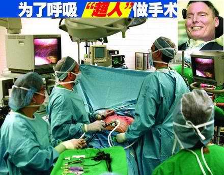 3月13日,曾經(jīng)扮演過“超人”的美國(guó)演員克里斯多佛·里夫成功接受肺部手術(shù)后在美國(guó)克利夫蘭大學(xué)校醫(yī)院舉行新聞發(fā)布會(huì)。2月28日,里夫在該醫(yī)院動(dòng)手術(shù)(見圖),安裝了一個(gè)胸腔橫膈膜震動(dòng)裝置。該裝置相當(dāng)于橫膈膜的起搏器,導(dǎo)線將外部電池控制器同肌肉及橫膈膜神經(jīng)相連接,通過電子方式促使橫膈膜進(jìn)行收縮以吸入空氣到肺部。1995年,克里斯托弗在事業(yè)高峰時(shí),因參加馬術(shù)比賽,意外落馬,脖頸撞到障礙賽的橫木,撞碎了第一頸椎,第二頸椎部分受傷。造成他無法正常呼吸,需要依賴呼吸器,手腳喪失知覺和運(yùn)動(dòng)能力,此后