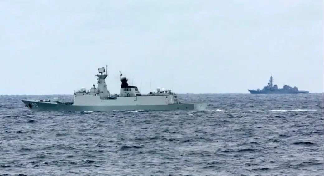 中俄海軍首次海上聯(lián)合巡航期間,日自衛(wèi)隊(duì)艦艇(右)對(duì)中方濱州艦(左)進(jìn)行跟蹤偵察(10月21日攝)。