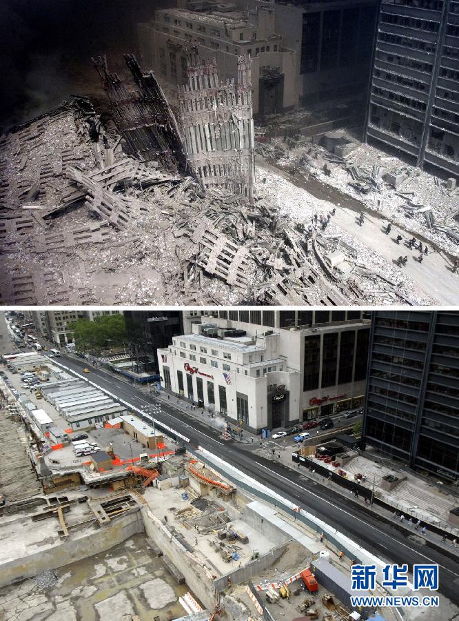 “零地帶”一詞先前被用于形容核爆炸區(qū)域,后用于描述極端和暴力事件發(fā)生地。2001年9月11日,恐怖分子劫持4架客機(jī),操縱其中兩架撞入世貿(mào)中心雙塔,致死大約3000人。該地也因此被稱為“零地帶”。十年前的“9·11”,這里是人間地獄,十年后的今日,這里正在重建。紐約市長邁克爾·布隆伯格說:“我們永遠(yuǎn)不會(huì)忘記這片被稱作‘零地帶’的區(qū)域遭受的破壞,永遠(yuǎn)不會(huì)。不過,是時(shí)候把這片16英畝(約合6.5公頃)的區(qū)域稱作‘世貿(mào)中心和國家9·11紀(jì)念館’了!薄9·11”恐怖襲擊以來,紐約在遭受重創(chuàng)的曼哈頓下城區(qū)域投資5.52億美元,興建公園、街道等市政設(shè)施并整修下水管道。數(shù)座全新摩天大樓將在世貿(mào)中心遺址拔地而起,而遺址區(qū)域地標(biāo)建筑“9·11”紀(jì)念館定于恐怖襲擊十周年之日對遇難者家屬開放,次日向公眾全面開放。這是“9·11”事件發(fā)生近9個(gè)月后,遭受毀滅性襲擊的美國紐約世貿(mào)中心已經(jīng)從一片廢墟(上圖,攝于2001年9月11日)變成一個(gè)新的建筑工地(下圖,攝于2002年6月4日)。新華社發(fā)(程麗編輯)