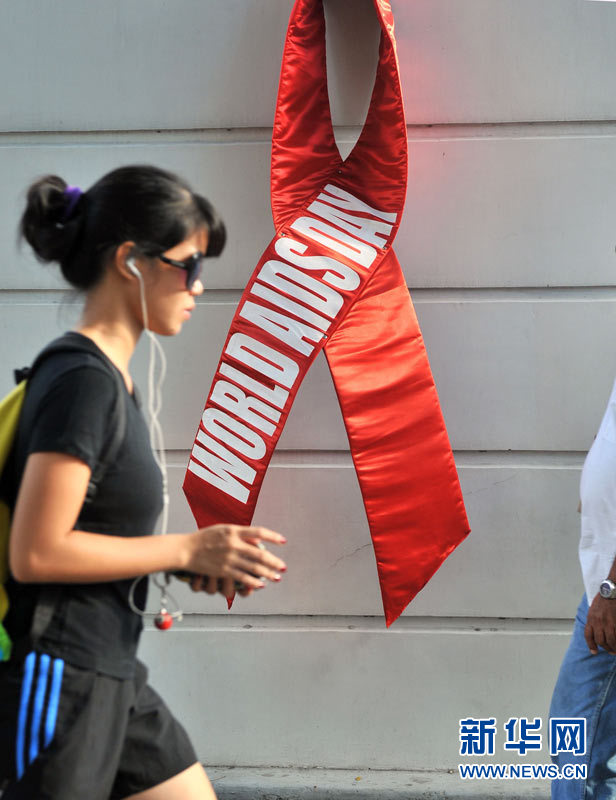 11月30日,行人從菲律賓馬尼拉世界衛(wèi)生組織辦事處外懸掛的紅絲帶旁走過。