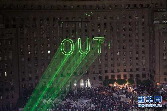 7月2日,在埃及開羅解放廣場,綠色激光投影在一座建筑上打出“離開”標(biāo)語。