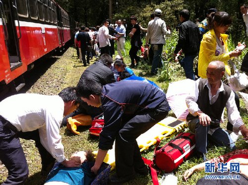 4月27日,救援人員在臺(tái)灣阿里山小火車翻車事故現(xiàn)場實(shí)施救援。新華社發(fā)