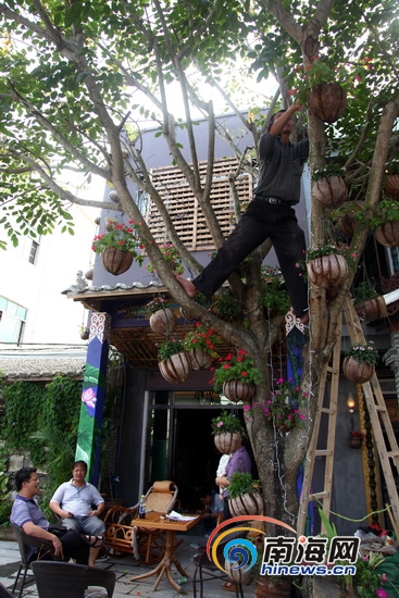備受矚目的博鰲小鎮(zhèn),以椰子做成的“天然盆景”扮靚街頭樹枝,別致而獨特,使喜慶的氛圍顯得十分濃烈(南海網(wǎng)記者張茂攝)