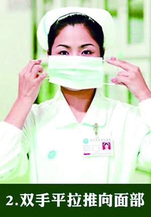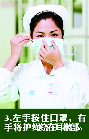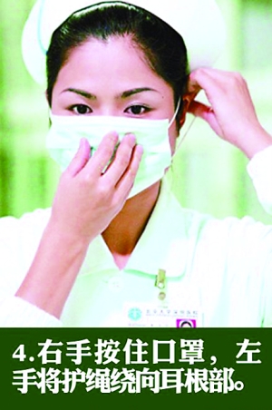 4、右手按住口罩,左手將護繩繞向耳根部。