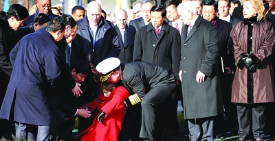 在白宮舉行的歡迎儀式上,美軍參謀長聯(lián)席會議主席穆倫上將夫人突然暈倒,一旁的中美兩國官員忙攙扶。據(jù)悉,她很快蘇醒,并無大礙!(jù)每日電訊報