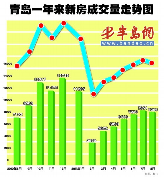 青島市房地產交易中心的統(tǒng)計數據顯示,8月份全市新建商品住宅共成交7366套,較7月份減少了585套,環(huán)比跌幅達7%。
