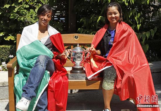 當?shù)貢r間6月3日,法網(wǎng)決賽前夕,中國選手李娜同意大利選手斯齊亞沃尼各披本國國旗,手握法網(wǎng)獎杯現(xiàn)身巴黎接受各國記者的采訪。