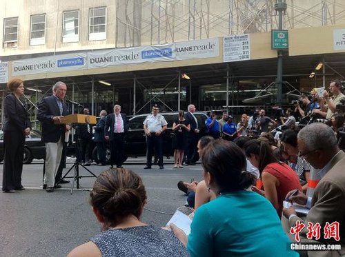 當?shù)貢r間24日,紐約帝國大廈發(fā)生槍擊案,造成十多人死傷。圖為紐約市長布隆伯格在帝國大廈附近召開緊急記者會介紹槍擊案進展。紐約警察局長凱利、紐約市議長柯魁英(Christine Quinn)等一同出席。李洋攝