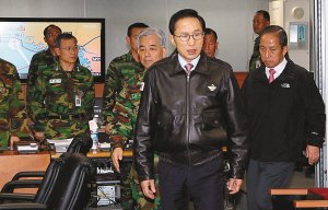 交火事件后,韓國總統(tǒng)李明博(前)抵達韓國軍隊聯(lián)合參謀本部控制中心,召開緊急會議。