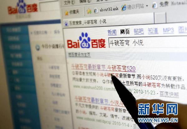 起點(diǎn)中文網(wǎng)上刊載的熱門小說《斗破蒼穹》通過百度文庫(kù)可以搜索到眾多盜版鏈接(11月24日攝)。 新華社記者 裴鑫 攝